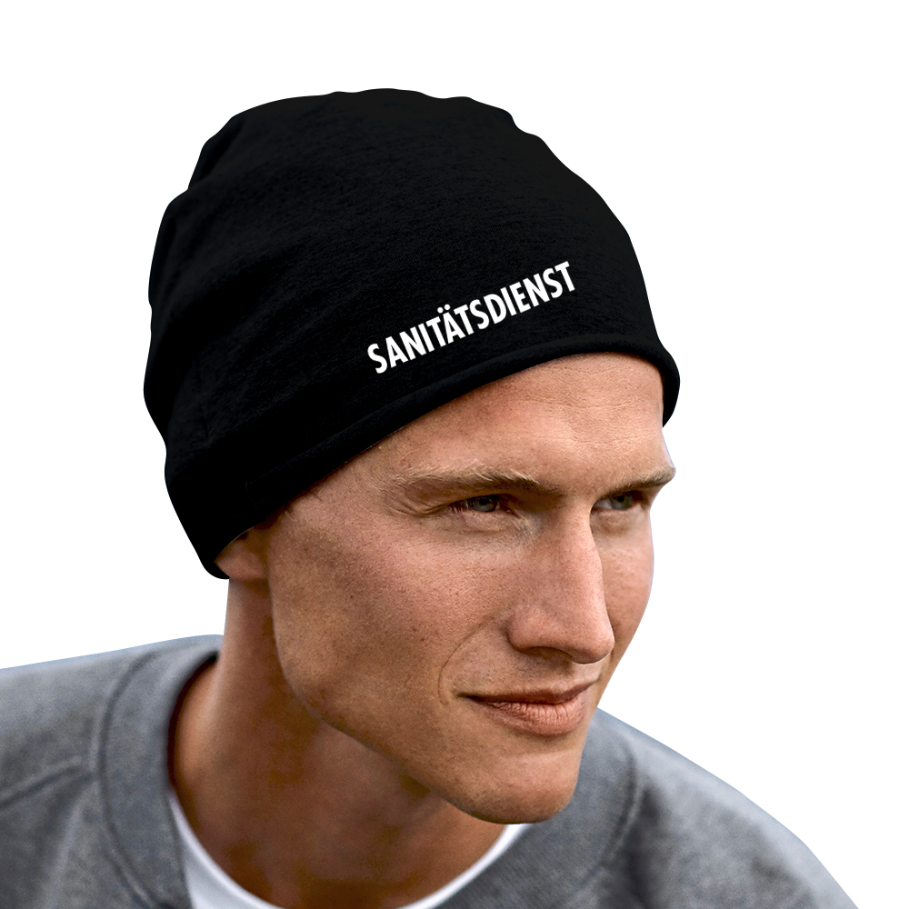 Longbeanie Slouch-Beanie Sommerbeanie mit Textildruck - SANITÄTSDIENST - SB55004 schwarz