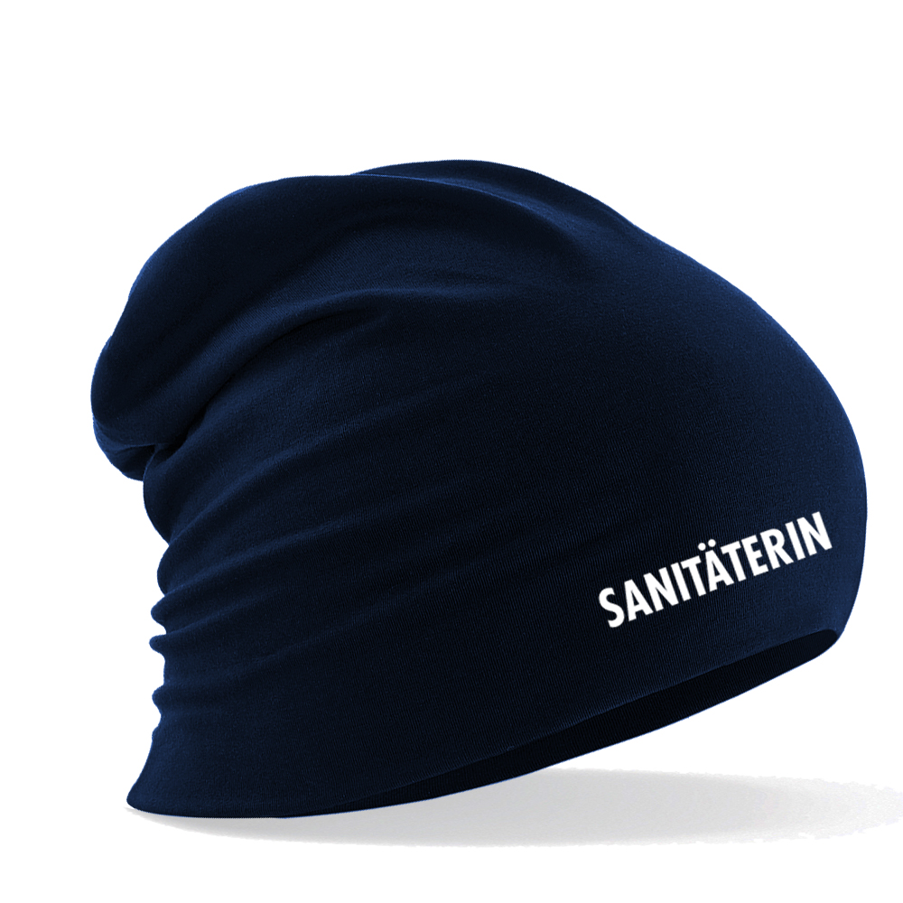 Ergänzen Sie Ihren urbanen Look mit einem Hauch von Professionalität und Komfort mit unserem Longbeanie Slouch-Beanie Sommerbeanie. Dieses zeitgemäße Accessoire verbindet lässige Eleganz mit einem Ausdruck von medizinischer Fachkompetenz. Das markante "SANITÄTERIN"-Motiv verleiht Ihrem Outfit einen femininen Touch und signalisiert gleichzeitig Einsatzbereitschaft und Pflichtbewusstsein.
