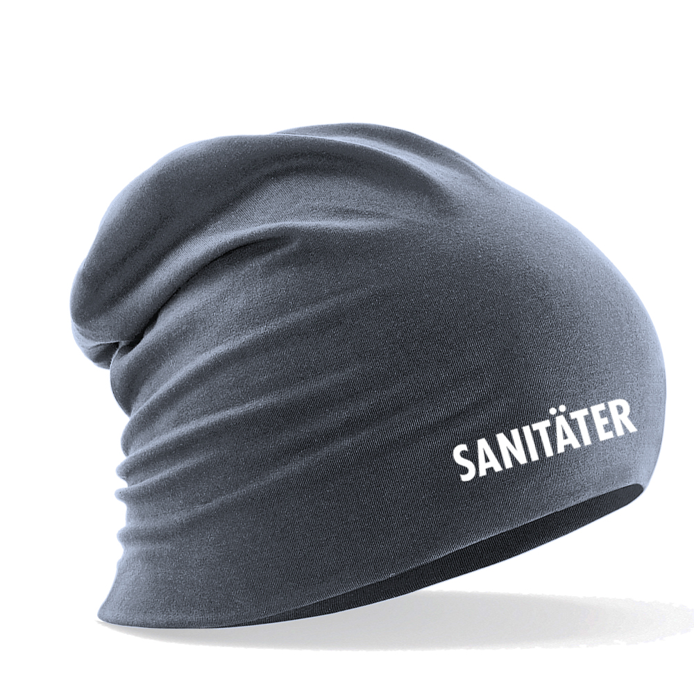 Longbeanie Slouch-Beanie Sommerbeanie mit Textildruck - SANITÄTER - 54449 grau
