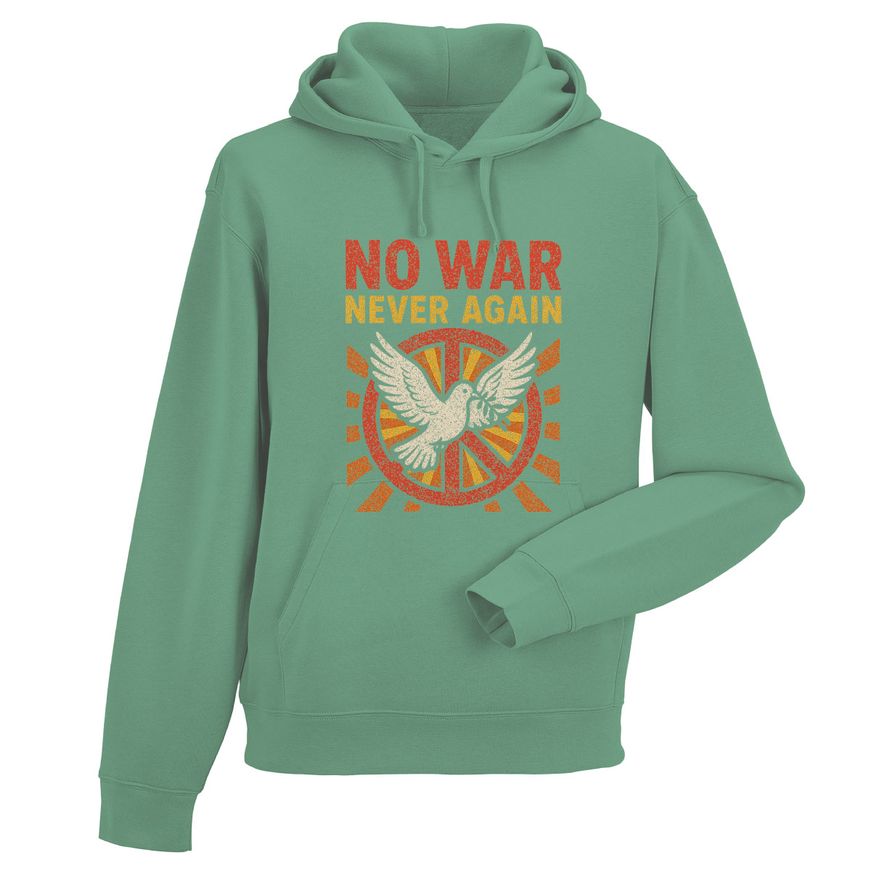 Dieser grüne Sweatshirt-Hoodie mit dem aussagekräftigen Print „NO WAR NEVER AGAIN“ und der Friedentaube steht für Frieden, Hoffnung und eine klare gesellschaftliche Haltung. Die frische grüne Farbgebung verleiht dem Hoodie eine natürliche, moderne Ausstrahlung und lässt das Motiv besonders wirkungsvoll erscheinen. Durch sein zeitloses Design eignet sich der Hoodie ideal für Alltag, Freizeit oder Veranstaltungen, bei denen Werte und Überzeugungen sichtbar gemacht werden sollen.