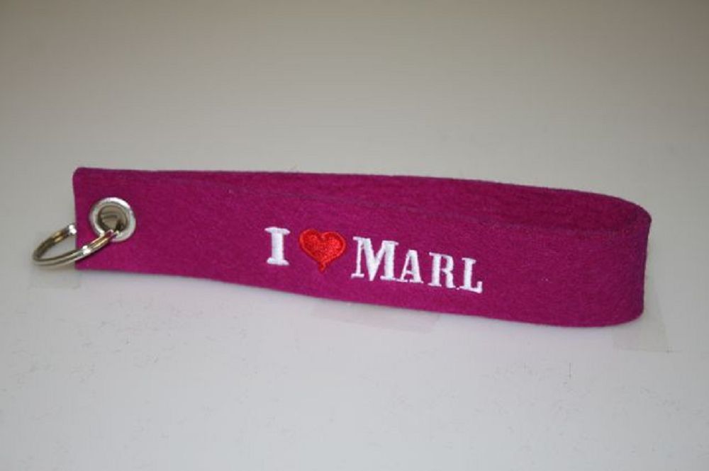 Dieser hochwertige Filz-Schlüsselanhänger hat die Einstickung: I LOVE MARL